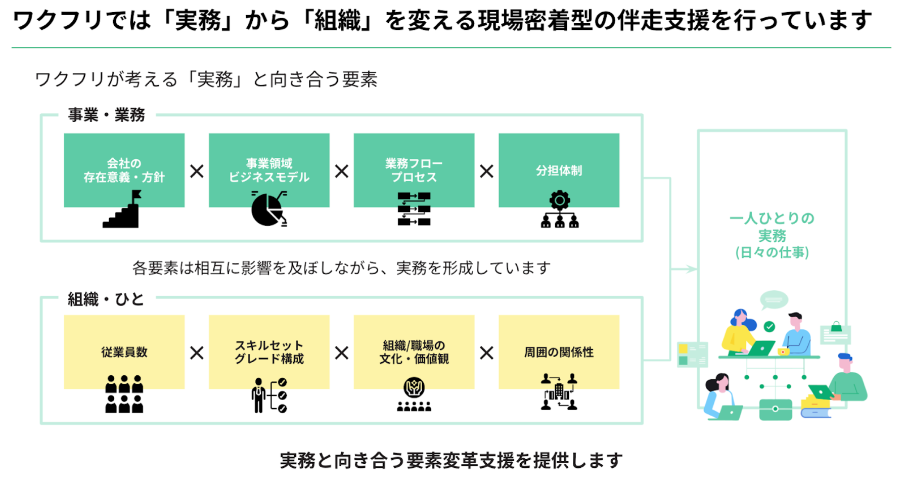 結局のところ、事業方針やビジネスモデル、業務プロセス、体制、スキル、文化、人間関係などはすべて絡み合って毎日の業務につながっているので、現場が変われば会社のミッション達成にもつながります。