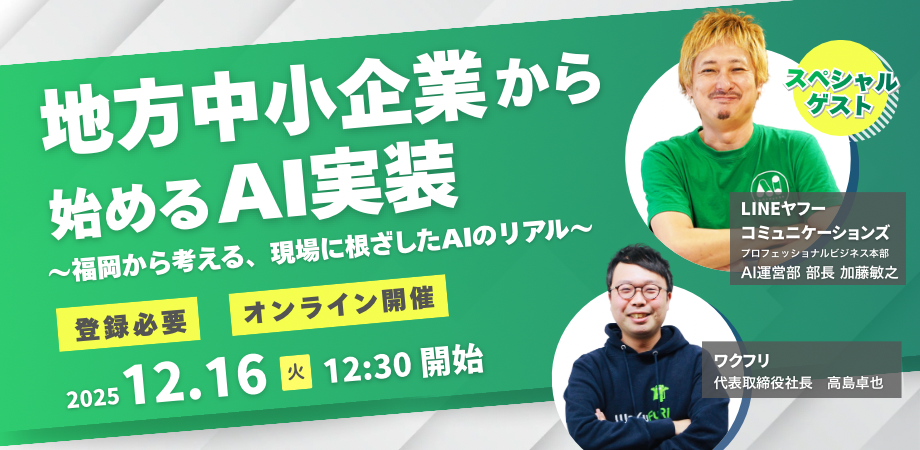 今回は、LINEヤフーコミュニケーションズ プロフェッショナルビジネス本部 AI運営部 部長の 加藤敏之氏 をお迎えし、ワクフリ代表 髙島 との対談形式で “地方の現場が本当に求めているAI実装” を深く掘り下げます。